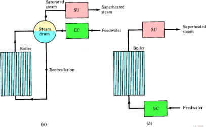 รูปแสดงผังแสดงการไหลในเครื่องกำเนิดไอน้ำแบบ (a) ดรัม (b) ผ่านรวดเดียว