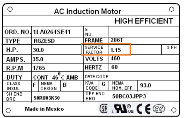 ตัวอย่างแผ่นป้ายมอเตอร์ 3 เฟสที่มีการระบุค่าเซอร์วิสแฟคเตอร์