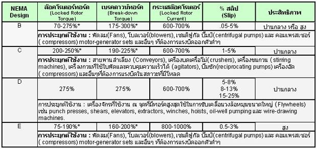 อินดัคชั่นมอเตอร์ ที่ออกแบบตามมาตรฐาน NEMA จะแบ่งเป็นประเภทต่างๆและมีคุณสมบัติทางความเร็วและแรงบิดที่แตกต่างกัน ดังนี้