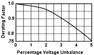 จะต้องทำอย่างไรเมื่อแรงดันไม่สมดุลย์ มอเตอร์กระแสสับชนิดสามเฟส หรือหลายเฟสโดยทั่วไปจะถูกออกแบบมาใช้งานได้ตามโหลดพิกัดได้ดีก็ต่อเมื่อแรงดันที่ขั้วต่อมอเตอร์มีความสมดุลย์ หรือคลาดเคลื่อนไม่เกิน 1 เปอร์เซ็นต์ และจะไม่แนะนำให้ใช้งานเมื่อแรงดันไม่สมดุลย์หรือคลาดเคลื่อนเกิน 5 เปอร์เซ็นต์ ดังนั้นหากเกิดกรณีที่แรงดันที่ขั้วต่อมอเตอร์ไม่สมดุลย์ การใช้งานมอเตอรจะต้องทำการลดพิกัดกำลังตามสัดส่วนเพื่อลดความเสียหายของมอเตอร์ โดยเทียบกับแฟคเตอร์ที่ใช้เป็นตัวคูณดังกราฟต่อไปนี้ ตัวอย่าง : การคำนวนหาเปอร์เซ็นต์ความไม่สมดุลย์ของแรงดันไฟฟ้า เมื่อกำหนดให้แรงดันแต่ละเฟส (RST) มีค่าดังต่อไปนี้ 460, 467, และ 450 โวลท์ ตามลำดับ |
