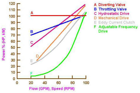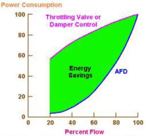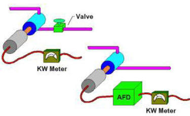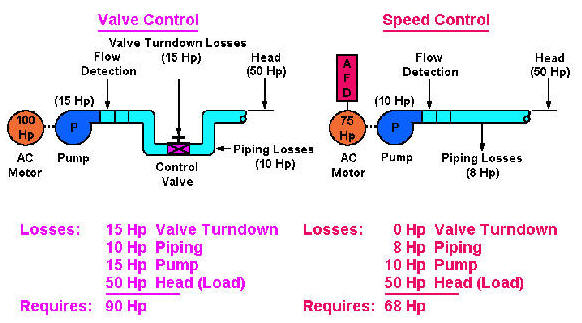 สาเหตุของการสูญเสียในระบบที่ใช้วาล์วจะเกิดจากการสูญเสียในตัววาล์วเอง ,ระบบการเดินท่อ ,ในตัวปั๊ม และกำลังในการขับโหลด 50 HP ดังนั้นรวมหมดทั้งระบบปั๊มจะต้องใช้กำลังขับเท่ากับ 90 HP และในส่วนของมอเตอร์เมื่อออกแบบใช้มอเตอร์ใช้งานที่ 90 % ก็จะต้องเลือกมอเตอร์ขนาดเท่ากับ 100 HP ดังแสดงให้เห็นตามตัวอย่าง ส่วนในระบที่ใช้ AFD’s จะไม่มีการสูญเสียในวาล์ว และในระบบการเดินท่อก็จะสามารถลดจำนวนการโค้งงอของท่อลงได้ ทำให้การสูญเสียในระบบเดินท่อลดลง การสูญเสียพลังงานในปั๊มก็ลดลง ในขณะเปรียบเทียบที่ความต้องการในการขับโหลดเท่ากันคือ50 HP ก็จะเห็นว่าความต้องการของปั๊มมีเพียง 68 HP และขนาดของมอเตอร์ที่ใช้ขับปั๊มก็มีขนาดเล็กลงเหลือีความต้องการเพียง 75 HPเท่านั้น