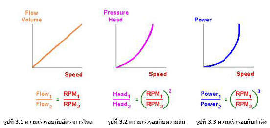 ส่วนกราฟรูปที่ 3.2 และสมการแสดงความสัมพันธ์ระหว่างความเร็วรอบกับแรงดัน (Pressure Head) พบว่า ความสัมพันธ์ของสัดส่วนแรงดันเป็นกำลังสองของสัดส่วนความเร็วรอบ ดังนั้นเมื่อเราลดความเร็วรอบ 50 % ความดันจะลดลงประมาณ 25 %