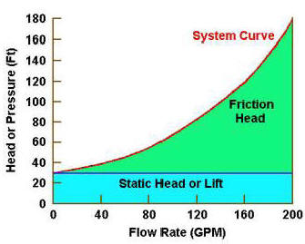 และจากกราฟรูปที่ 3.3 และสมการแสดงความสัมพันธ์ระหว่างความเร็วรอบกับกำลังงาน พบว่าสัดส่วนของกำลังงานเป็นกำลังสามของความเร็วรอบ ดังนั้นหากเราลดความเร็วรอบลง 50 % กำลังงานที่ใช้ในการขับเคลื่อนจะถูกใช้เพียง 12.5 % จากเดิม ซึ่งหากพิจารณาจากจุดนี้ จะทำให้มองเห็นศักยภาพในการลดการใช้พลังงานได้อย่างชัดเจน และต่อไปเราจะมาพิจารณาถึงคุณสมบัติที่น่าสนใจของระบบปั๊มโดยเริ่มต้นจาก Static head หรือเรียกว่า lift ซึ่งหมายถึงความสูงของเหลวที่เป็นไปได้จากแหล่งจ่ายจนถึงทางด้านขาออก (outlet) ซึ่งจากตัวอย่างในรูปที่ 4 นี้ความสูง Statichead จะเท่ากับ30 ฟุต และสิ่งที่ต้องการพิจารณาเป็นอันดับต่อไปก็คือ แรงเสียดทานในปั๊มหรือ friction head ซึ่งหมายถึง กำลังที่ต้องการในการที่จะต่อต้านกับแรงเสียดทาน และความสูญเสียแรงดันที่เกิดขึ้นในขณะที่มีการไหลของของเหลวในท่อ ในวาล์ว และอุปกรณ์ที่เกี่ยวข้องในวงจรการเดินท่อ ซึ่งการสูญเสียเหล่านี้มีความสัมพันธ์กับการไหลอย่างไม่เป็นเส้นตรง ดังรูป