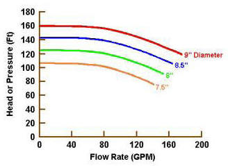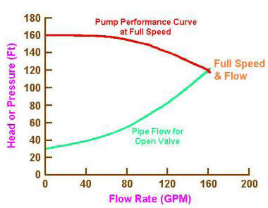 ในการเลือกจากกราฟจะเห็นว่า ณ. จุดตัดกันของระหว่าง เส้นโค้งของระบบ( System curve) กับ เส้นโค้งแสดงสมรรถนะของปั๊ม (pump performance curve) คือความต้องความดันที่ความสูง 120 feel ด้วยอัตราการไหล 160 GP (ระบบจะทำงานด้วยข้อจำกัดนี้ แต่จะเปลี่ยนข้อจำกัดนี้ ระบบจะต้องมีอุปกรณ์ หรือปัจจัยอื่น แทรกเข้ามาในระบบ)