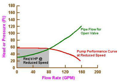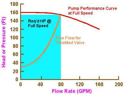 แต่ในทางปฏิบัติเทคนิคการควบคุมการไหลโดยทั่วไปจะมีการเพิ่ม Trotting valve ซึ่งจะทำให้เกิดการต้านการไหล และเพิ่มการสูญเสียในระบบ และส่งผลทำให้เส้นโค้งของระบบมีการเปลี่ยนแปลงไป ดังรูปที่ 7 โดยอัตราการไหลจะหาได้จากจุดที่เส้นโค้งทั้งสองตัดกัน จากตัวอย่างจะเห็นว่าความดันจะลดลงมาที่ 155 ฟุต และอัตราการไหล จะลดลงมาที่ 80 GPM