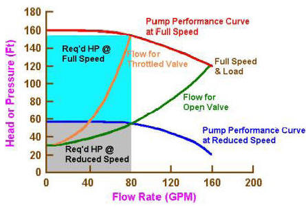 ดังนั้นหากนำระบบทั้ง 2 ระบบ คือระบบที่ใช้วาล์ว กับใช้ระบบที่มีการปรับความเร็วด้วย AFD’s มาเปรียบเทียบกันในขณะ ที่มีความต้องการอัตราการไหลของระบบอยู่ที่ 80 GPM และความความดันอยู่ที่ 57 ฟุต (Heads)เท่ากัน และอัตราส่วนการใช้กำลังงานยังคงเป็นสัดส่วนกับ head pressure และ flow rate ดังแสดงในพื้นที่สีเทา ก็จะได้กราฟหรือเส้นโค้งดังแสดงในรูปที่ 9