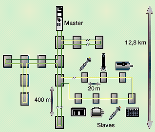 ♦    ระยะทางไกลสุดระหว่าง remote bus device เท่ากับ 400 เมตร 1,312.336 ฟุต) โดยมีระยะทางรวมทั้งหมดเท่ากับ 13 กิโลเมตร (8.078 ไมล์)