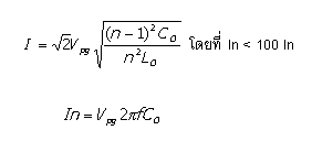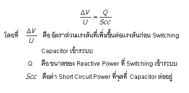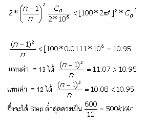 ซึ่งจะเห็นว่า kVAr ที่หามาได้จะมีผลทำให้แรงดันระบบเปลี่ยนแปลงมากที่สุด = 2.76 % เท่านั้น จาก ตัวอย่างที่ยกมา ดังนั้นขนาดของ kVAr ต่อ Step ที่มีขนาดมากที่สุดคือ ออกแบบให้เป็นหนึ่ง Step ตาม ที่ออกแบบ ส่วนมากไม่มีผลต่อแรงดันมากนัก ดังนั้นจึงกลับไปพิจารณาหัวข้ออุปกรณ์ที่จัดหาได้ง่าย พิจารณาจากกระแส Inrush Current ของ Step สุดท้าย ปกติการ Switching Capacitor เข้าระบบจะเกิดมีกระแส Inrush จำนวนมากไหลเข้า Cap Step ซึ่ง พิจารณาว่าไม่เกินค่ามาตรฐานที่กำหนดไว้คือ 100 เท่า ของกระแส Rated ของ Cap Step ปกติปรากฏการณ์นี้จะมีผลน้อยคือมีค่ากระแส Inrush น้อยถ้ามีเพียง Steo เดียว เพราะ Impedance ของระบบจะช่วยต้านไว้ แต่ถ้า Cap Step มีหลาย Step จะเกิดปรากฏการณ์ Back To Back Inrush Current ขึ้น และโดยมีผลให้ Step ที่จะนำเข้าระบบหลังสุดต้องรับกระแส Inrush นี้ขึ้นสูงมากโดยพิจารณาดังนี้ ที่ Step n จะรับกระแส Inrush สูงมากถ้ามี Cap ต่ออยู่ก่อนหน้าโดยพิจารณาจากสูตร |
