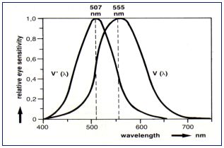 ที่ความสว่างระดับต่ำ ความไวของตาเลื่อนไปทางซ้าย (คือ ไปทางความยาวคลื่นที่สั้นลง) ด้วยความไวสูงสุดที่ 507 นาโนเมตร ซึ่งเรียกว่า การเห็นในภาวะมืด