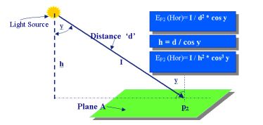 ความสว่าง ณ จุดหนึ่งบนพื้นราบซึ่งไม่ตั้งฉากกับทิศทางของความเข้มการส่องสว่างมีค่าเท่ากับความเข้มการส่องสว่างในทิศทางของจุดนั้น หารด้วยกำลังสองของระยะทางระหว่างแหล่งกำเนิดแสง และต้องนำไปคูณกับโคไซน์ ของมุม g ซึ่งทิศทางการตกของแสงตั้งฉากกับพื้นราบ ดังนี้: