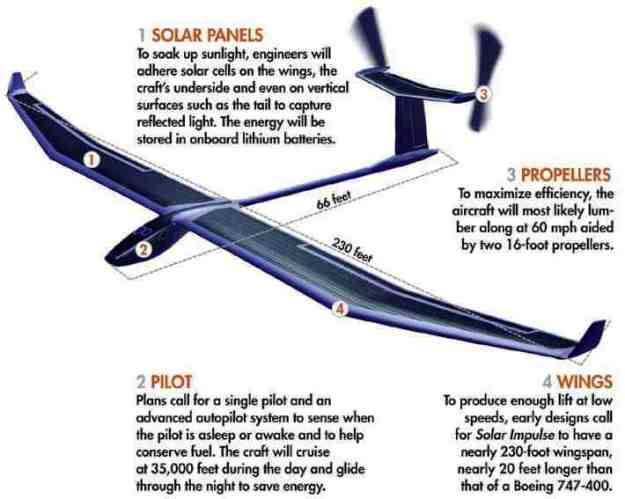 ยานบินพลังงานสะอาดนี้ ติดตั้งเซลล์รับพลังงานแสงอาทิตย์ 12,000 ตัว ที่บริเวณปีกทั้ง 2 ข้าง ซึ่งความยาวของปีก มีความยาวเท่าขนาดเครื่องบินแอร์บัส 340 เพื่อส่งกำลังไปยังเครื่องยนต์จำนวน 4 เครื่อง ทุกอย่างออกแบบให้มีน้ำหนักเบามาก