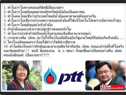 4. ต้องทวงคืน ปตท. ให้กลับมาเป็นของรัฐ 100% โดยประโคมให้ประชาชนเชื่อว่าถ้าเป็นของรัฐก็ไม่ต้องมีกำไรใดๆ (มีบอกว่า เอากำไรแสนล้านไปลดราคาน้ำมันได้ลิตรละห้าบาท เพราะ ปตท. ขายน้ำมันยี่สิบล้านลิตรต่อปี)
