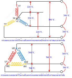 ถ้าใช้ไฟ 3 เฟส 220 ก็ให้ต่อที่มอเตอร์เป็นแบบเดลต้า แต่ถ้าใช้ไฟ 3 เฟส 380 V. ก็ให้ต่อที่มอเตอร์เป็นแบบ สตาร์ |
