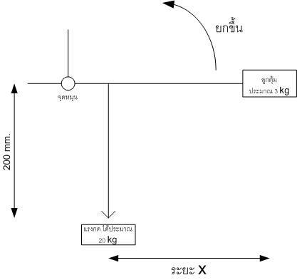 อีก เวบหนึ่ง เขาเฉลยไว้ดังนี้ ให้ระยะทางจากลูกตุ้ม ถึงจุดหมุน เป็น Z ระยะทางจากจุดหมุน ถึงแรงกด เป็น Y 3*Z=20*Y Y=(3*Z)/20 เพราะฉนั้น ไม่สามารถให้ ค่าเป็นตัวเลขได้ นอกจาก สมการด้านบน ทีเหลือ ระยะ 200 มม. เป็นตัวเลขหรอก ยกเว้น ว่า โจทย์มีมากกว่านี้ แล้วลงไม่หมด รวมถึง คนตั้งกระทู้ ได้ตามหรือเปล่าไม่ทราบ อาจไม่ได้ตามก็ได้ เพราะต้อง ส่งการบ้าน เมื่ออาทิตย์ที่แล้ว |