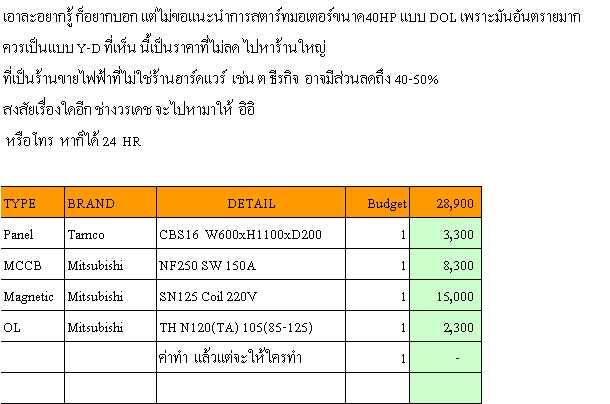 ผมต้องการประกอบตู้ใช้เปิด-ปิดมอเตอร์ขนาด 40 แรงม้ามีคำถามดังนี้ 1.เบรกเกอร์ใช้ขนาดเท่าไร 2.คอนแทคเตอร์รุ่นไหน (ใช้สตาทแบบไดเรกคอนแทคเตอร์ตัวเดียว 3.โอเวอร์โหลดรุ่นไหน 4.ต้องการใช้อุปกรณ์ป้องกันไฟขาดเฟสด้วย แนะนำด้วยครับ 5.ขนาดตู้สำหรับใส่อุปกรณ์ข้างต้น ขอเป็นยี่ห้อมิตซูก็ดีนะครับหาง่ายดี อ้อ! งบประมาณเท่าไรคร่าวๆให้ด้วยนะครับ พ่อดีจะติดตั้งเครื่องสับขวดพลาสติกให้พี่ชายน่ะครับ ขอบคุณล่วงหน้านะครับ |