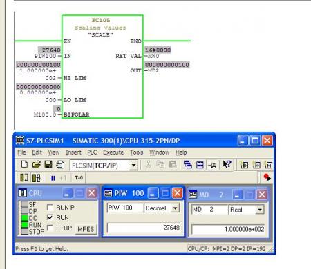 ผมจึงขอยกตัวอย่างเลยก็แล้วกัน ว่าเป็น Analog Input 4 - 20 ma. แต่ตอนนี้ผมไม่มี CPU , Analog , Simulator อยู่ ผมขอใช้ PLCSIM แทนก็แล้วกันนะครับ ( เหมือนๆ กัน ) 1. ผมกำหนดแอดเดรส Analog Input 4 - 20 ma. เป็น PIW100 ครับ 2. ใช้ FC 105 Scale Convert : ทำการสเกลค่า 3. กำหนด Hi = 100.0 และ Low = 0.0 Output = MD2 4. ป้อนค่า PIW100 ( แทนการใช้ตัว Simulator ครับ 4-20 ma ก็จะเท่ากับ 0-27648 ครับ ) รูปที่1 ป้อนค่า 6912 ( 8ma ) ค่า Output ที่ได้คือ 25.0 |