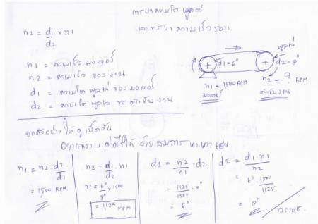 n2=working rpm d1=motor pulley d2=working pulley ืn1=n2.(d2/d1) n2=n1.(d1/d2) d1=d2.(n2/n1) d2=d1.(n1/n2) ใครรู้มากกว่านี้ ช่วยที อิอิ |