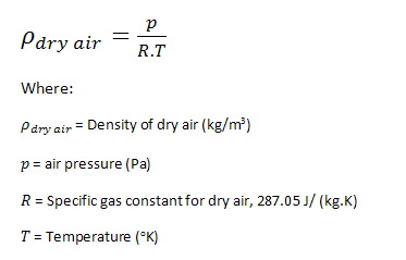 As an example let us calculate the density of dry air at sea level in international standard atmosphere conditions of pressure (1013.25 hPa or 101325Pa) and temperature (15oC). Remember that to convert oC to oK you need to add 273.15. Density = 101325 / (287.05 * (15 + 273.15)) = 1.225 kg/m3 |