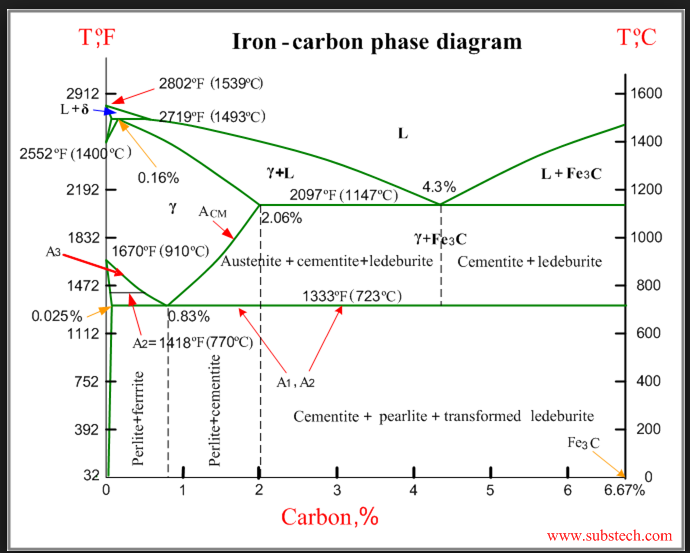 เฟสไดอะแกรม เหล็ก-คาร์บอน มีไว้เพื่อบอกว่าที่เปอร์เซ็นคาร์บอนและที่อุณหภูมิต่างๆนั้นเหล็กจะมีลักษณะอย่างไร ตามชื่อแหละค่ะ เฟส ก็คือแบ่งเป็นบริเวณของใครของท่าน ซึ่งเฟสไดอะแกรมตัวนี้จะใช้สำหรับการอบชุบหรือปรับปรุงสมบัติของเหล็กค่ะ สมมติว่าเรามีเหล็กคาร์บอน 2.06% (แกนนอนคือ %คาร์บอน) แล้วต้องการทำให้เหล็กนั้นมีโครงสร้าง Austenite+cementite+ledeburite เราก็ต้องใช้อุณหภูมิในการอบชุบไม่เกิน 1147 C ถ้าเกินไปแล้วมันก็จะเปลี่ยนโครงสร้างไปเป็นอย่างอื่น แต่ที่อุณหภูมิเดียวกันแต่%คาร์บอนเป็น 4.3% เหล็กก็จะเปลี่ยนเป็นเฟสของเหลวหรือหลอมละลายนั่นเองค่ะ ซึ่งแผนภูมิทำไว้ให้ดูเข้าใจง่ายและสะดวกต่อการนำไปใช้งานอ่ะค่ะ |