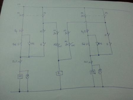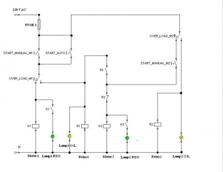 ลักษณะคือ เมื่ออยู่ใน โหมด Auto มอเตอร์ตัวที่ 1 จะทำงานเมื่อตัวที่ 1 มีปัญหา เนื่องจาก โอเวอร์โหลด ทริป ร้อน จะสลับการทำงานไปที่ตัวที่ สอง หรือ ทำงานเสริมกัน ในบางครั้ง ส่วนแบบ Manual นั้น จะเลือก ออนมอเตอร์ตัวไหนก้ได้ หรือ ออนพร้อมกันก็ได้ เมื่อ กด stop จะหยุดการทำงาน ขอวงจร คอนโทล หน่อยนะครับใครรู้ช่วยหน่อย จะทำเป็นโปรเจคจบนะครับ ลองหลายวันแล้วไม่ได้ซักที