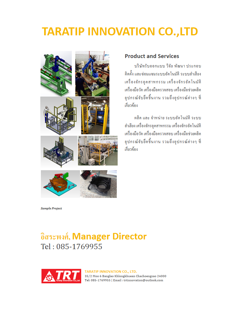 TARATIP INNOVATION CO., LTD 35/2 Moo 6 Banglao Khlongkhuean Chachoengsao 24000 Robot Control Systems Ultrasonics Welding. CO2 PLC. Computer Control, AGV Modified & Upgrade Machine Inverter, Servo Drive & Motor Automation Systems Design Jig fixture design for improve productivity. ติดต่อ อิสระพงศ์ เตียวยวด 085-1769955 trtinnovation@outlook.com |