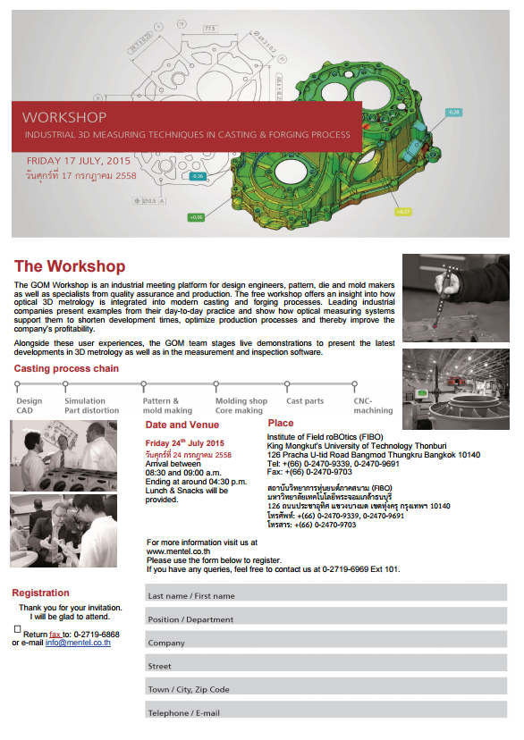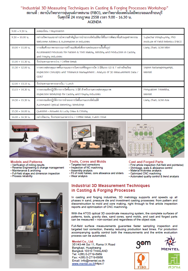 บริษัท เมนเทลจำกัดร่วมกับ สถาบันวิทยาการหุ่นยนต์ภาคสนาม FIBO สำนักงานคณะกรรมการนโยบายวิทยาศาสตร์ เทคโนโลยีและนวัตกรรมแห่งชาติ และ บริษัท GOM mbH ประเทศเยอรมันนี ขอเชิญเข้าร่วมงาน "Industrial 3D Measurement Techniques in Casting & Forging Processes" ในวันศุกร์ที่ 24 กรกฎาคม 2558/Friday 24th July 2015 จัดที่ FIBO พระจอมเกล้าบางมดน่ะครับ ตามรายละเอียดด้านล่าง สอบถามรายละเอียดเพิ่มเติมได้ที่ 02 719 6969 ext. 101 |