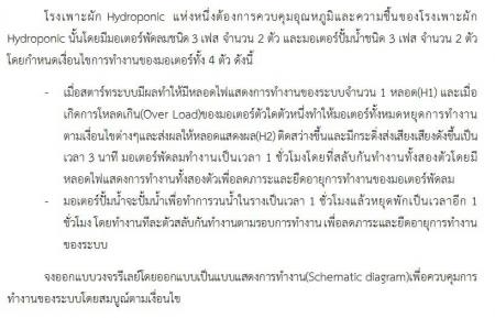 ต้องการควบคุมอุณหภูมและความชื้น โดยมีมอเตอร์พัดลม 3เฟสจำนวน 2ตัว มอเตอรปั้มน้ำชนิด3เฟส จำนวน2ตัว เงื่อนไขมอเตอร์ทั้ง4ตัว ดังนี้ ...สตาร์ทระบบมีผลทำให้หลอดไฟแสดงการทำงาน1หลอด(H1)และเมื่อเกิดการโหลดเกิน (over load)ของมอเตอร์ตัวใดตัวหนึ่ง ทำให้มอเตอร์ทั้งหมดหยุดการทำงานตามเงื่อนไขต่างๆและส่งผลให้หลอดแสดงผล(H2) ติดสว่างขึ้น และมีกระดิ่งเสียงดังขึ้นเปนเวลา3นาที มอเตอร์พัดลมทำงานเป็นเวลา1ชั่วโมง โดยที่สลับกันทำงานทั้งสองตัวโดยมีหลอดไฟแสดงการทำงานทั้ง2ตัว ...มอเตอรืปั้มน้ำจะทำงานเป้นเวลา1ชั่วโมงแล้วหยุดพักเป็นเวลา1ชั่วโมง โดยทำงานสลับกันทำงาน |