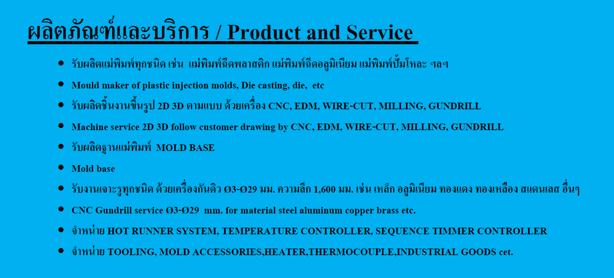 933/2-3 หมู่ที่ 2 ต.บางปูใหม่ อ.เมืองสมุทรปราการ จ.สมุทรปราการ 10280 Tel:091-7581621 , 02-7099485 Fax:02-7098655 E-Mail : smt.moldandparts@gmail.com http://www.smt-moldandparts.com 1. รับจ้างเจาะรูน้ำ รูฮิตเตอร์ รูลม เจาะได้ Ø3 - Ø31 เจาะได้ลึกสุด 2100 mm. เช่นเหล็กอลูมิเนียม ทองแดง ทองเหลือง สแตนเลส อื่น ๆ 2. เจาะ TAP M3 - M64 , TAP PT1/8 – PT3/4 3. งาน Rough Cut Stock 0.02 mm. 4. งานปาดฉาก Bore Guide 4. ทำตามแบบ 2D-3D ส่งแบบมาขอราคาทาง E-mail กับทาง Line ก่อนได้นะคะ Mobile : 099-492-1162 (มิ้นท์) @LINE เบอร์ด้านบนได้เลยค่ะ |