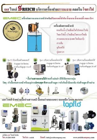 เอส ไรคส์ ขายปั๊ม EMEC ปั้มสูบจ่ายสารเคมี Metering Pump, Dosing Pump สูบจ่ายสารเคมีได้ตามปริมาณที่ต้องการอย่างแม่นยำ ใช้สำหรับสูบจ่ายของเหลว เครื่องจ่ายสารละลายสารส้ม เครื่องจ่ายสารละลายปูนขาว เครื่องจ่ายโพลิเมอร์ สาร PAC ปั๊มจ่ายสารส้ม ปูนขาว แพค โพลิเมอร์ คลอรีน แอนตี้สเกล เครื่องจ่ายน้ำยากัดตะกรัน กรดเกลือ โซดาไฟ สูบจ่ายสารเคมี แม่นยำ ซึ่งจะทำให้การควบคุมการผสมสารเคมีต่างๆ ได้อย่างคงที่ และสม่ำเสมอตลอดเวลา สามารถปรับตั้งอัตราการสูบจ่ายได้ตามความต้องการ • ปั๊มจ่ายสารเร่งการตกตะกอนเพื่อช่วยปรับสภาพน้ำให้ใสสะอาด • ปั๊มจ่ายสารคลอรีนเพื่อทำลายสารอินทรีย์ ควบคุมและฆ่าเชื้อโรคในน้ำ • ปั๊มจ่ายสารเพื่อปรับสภาพน้ำ ปรับค่ากรด ปรับค่าด่าง ปรับปรุงสภาพน้ำ • ปั๊มจ่ายสารส้มหรือ PACl ที่เหมาะสมในการผลิตน้ำประปา และเกิดความประหยัดสูงสุด สอบถามข้อมูลเพิ่มเติมได้ที่ 02-2618818 หรือ marketing@sreichcompany.com ฝ่ายการตลาด |